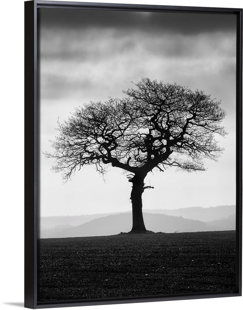 <p>A black and white photograph of a lone tree standing in a field with a fog covered landscape behind it.</p>