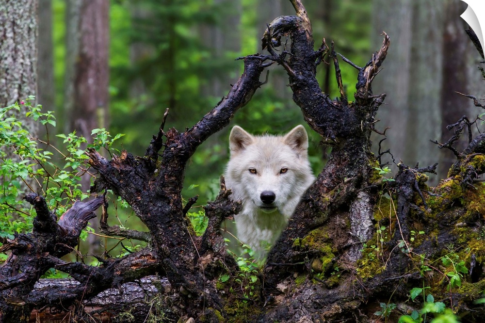 <p>A portrait of a white wolf seen through gnarled branches of a dead tree.</p>