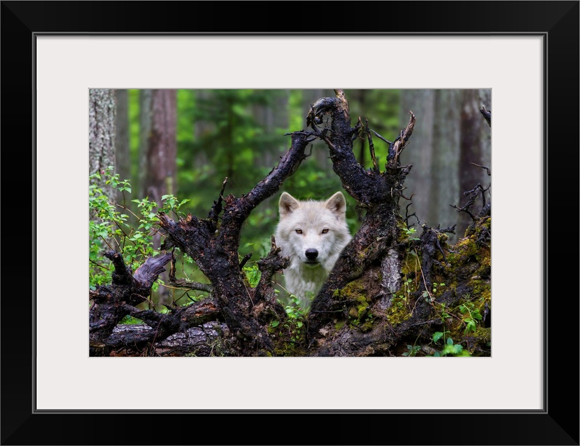 <p>A portrait of a white wolf seen through gnarled branches of a dead tree.</p>