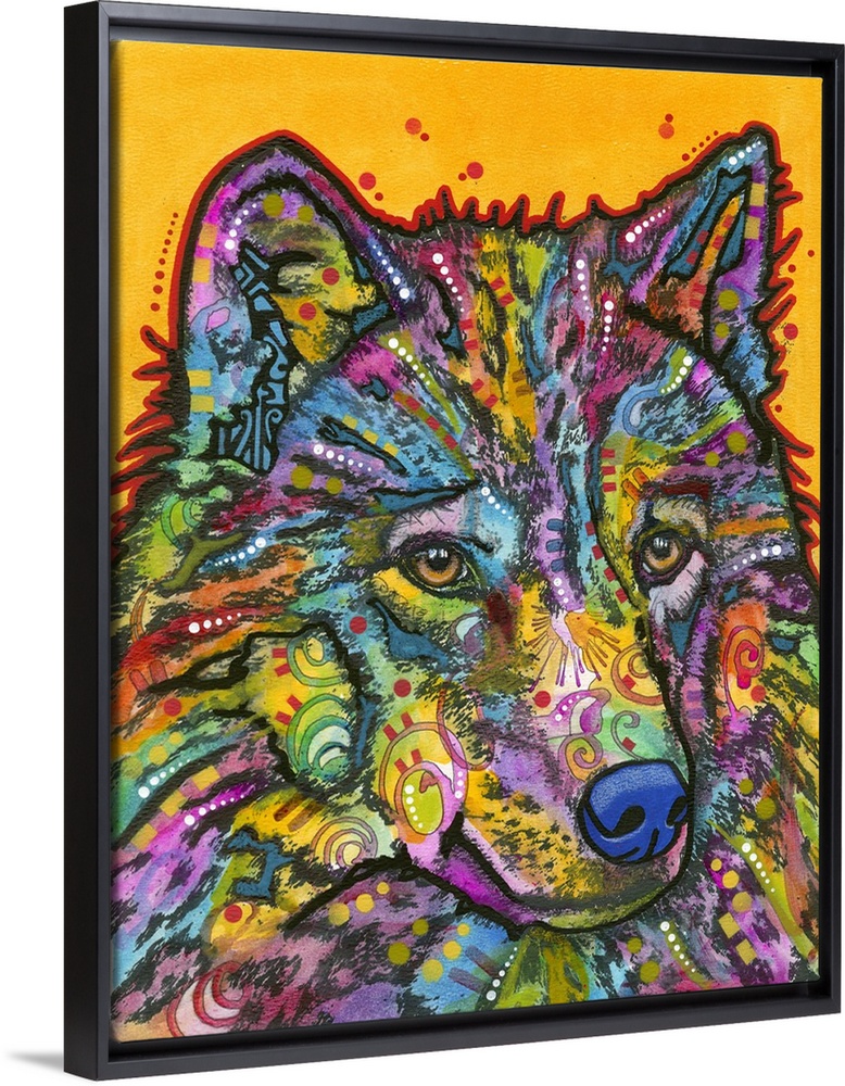 <p>Colorful painting of a wolf with abstract designs on a yellow background with small red dots.</p>