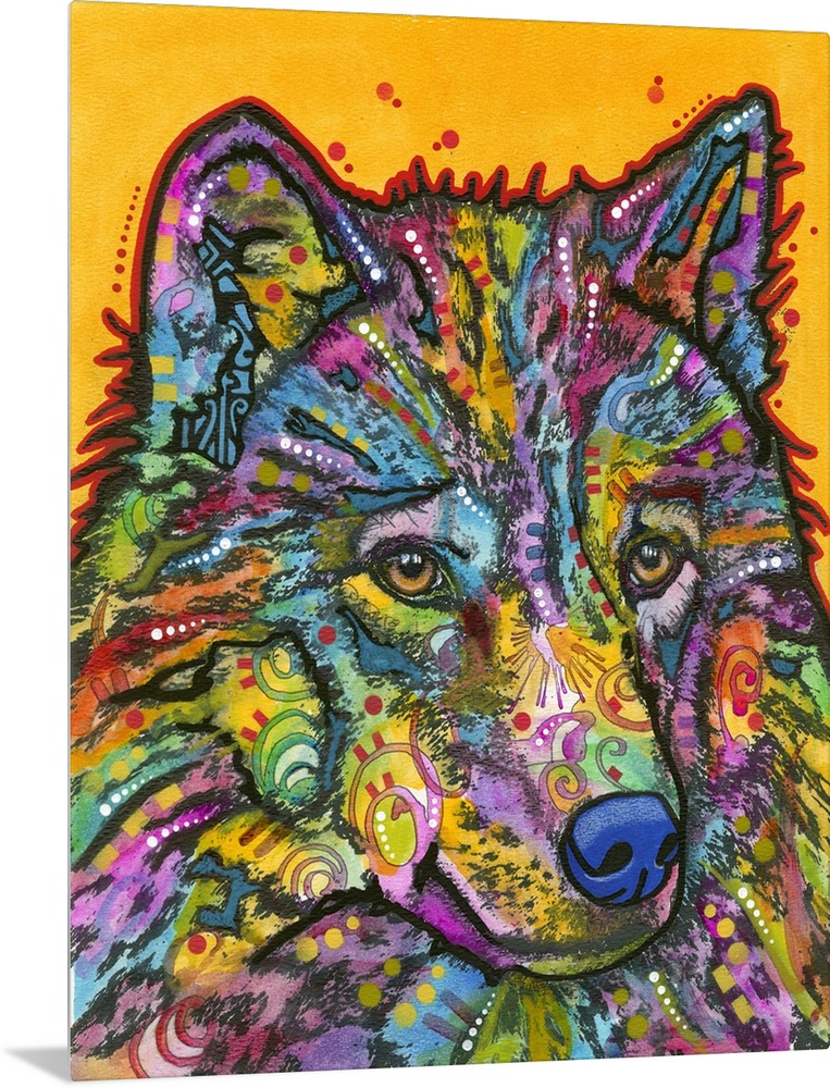 <p>Colorful painting of a wolf with abstract designs on a yellow background with small red dots.</p>