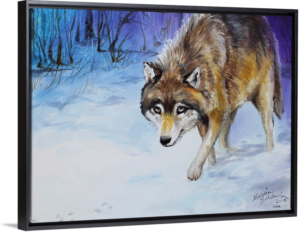 <p>Contemporary painting of a lone wolf in snow scene, tracking his prey in cool tones.</p>