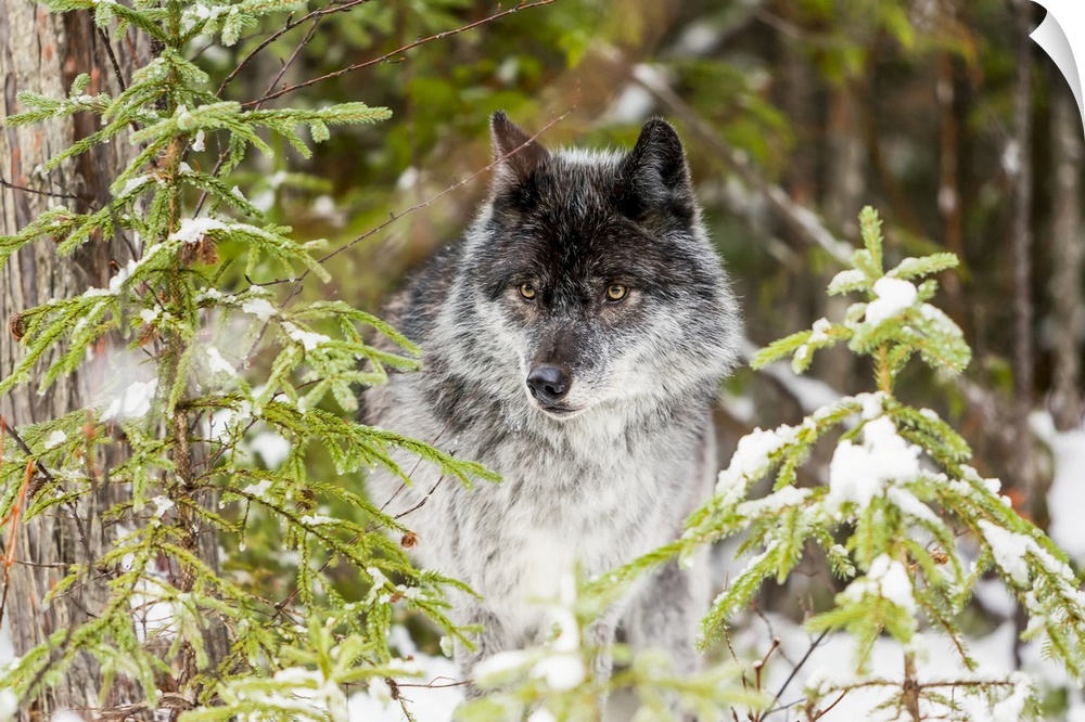 <p>Wolf (Canis lupus) looking out from trees in snow; Golden, British Columbia, Canada</p>