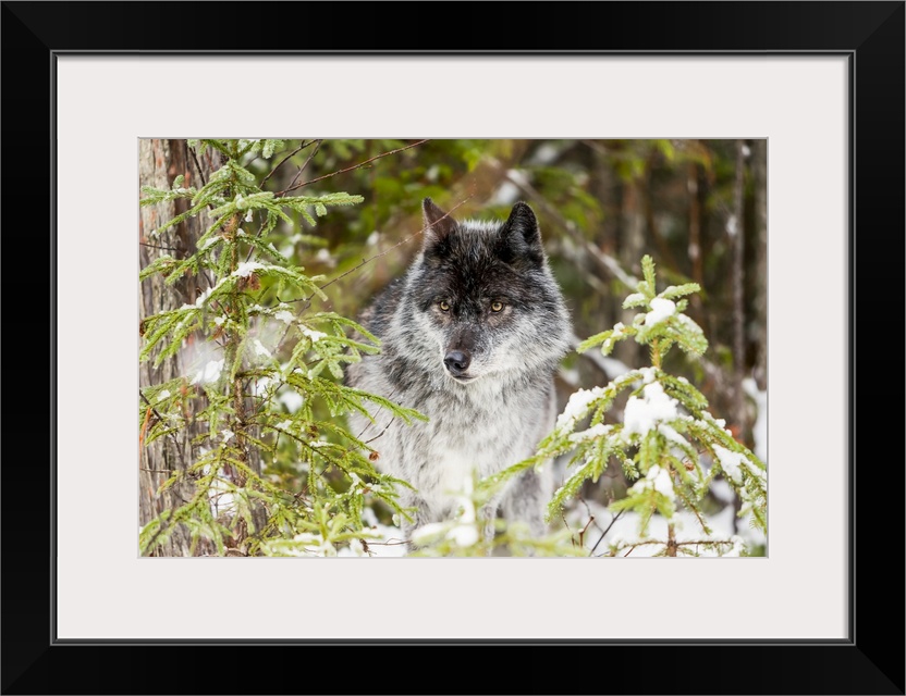 <p>Wolf (Canis lupus) looking out from trees in snow; Golden, British Columbia, Canada</p>