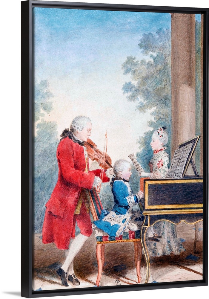 <p>Carmontelle (French, 1717-1806), Wolfgang Amadeus Mozart in Paris as a child, playing piano while his father Jean-Georg-Leopold accompanies on the violin and his sister Maria-Anna sings, 1763, watercolor and pencil on paper, 19.5 x 12.5 cm (7.7 x 4.9 in), Musee Conde, Chantilly, France.</p>