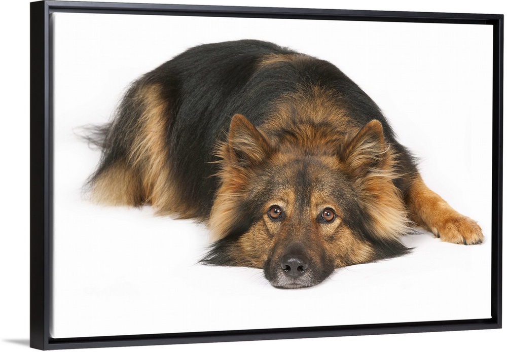 <p>Wolfsptiz/German Shepherd Mix! Female dog lying on white paper. Stockphoto.</p>