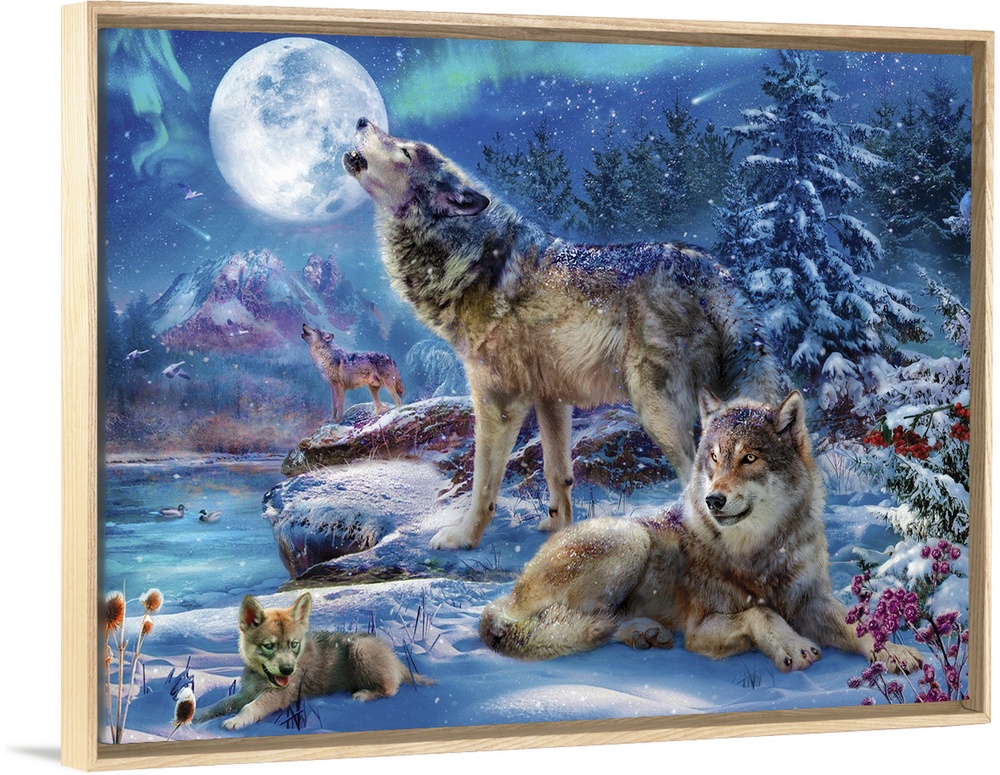 <p>Illustration of a pack of wolves howling at the full moon in a snowy setting.</p>