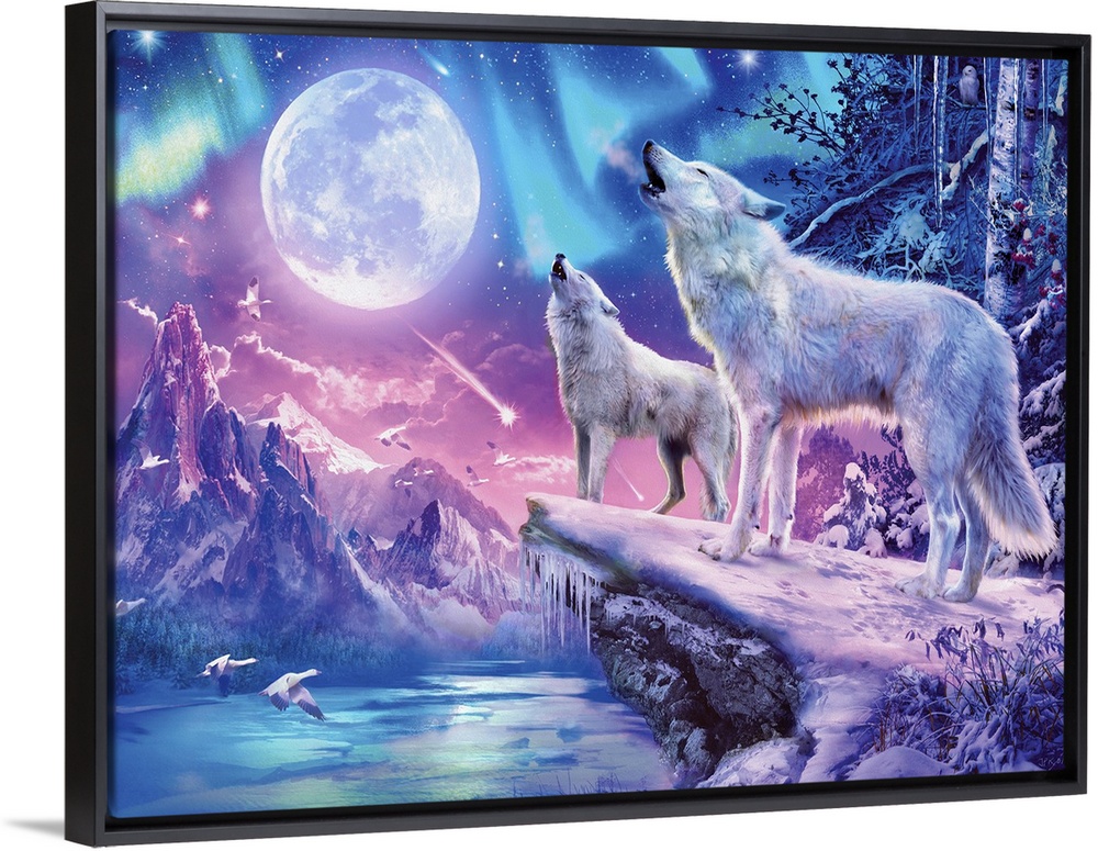 <p>Illustration of two wolves howling at the full moon in a snowy mountain scene.</p>