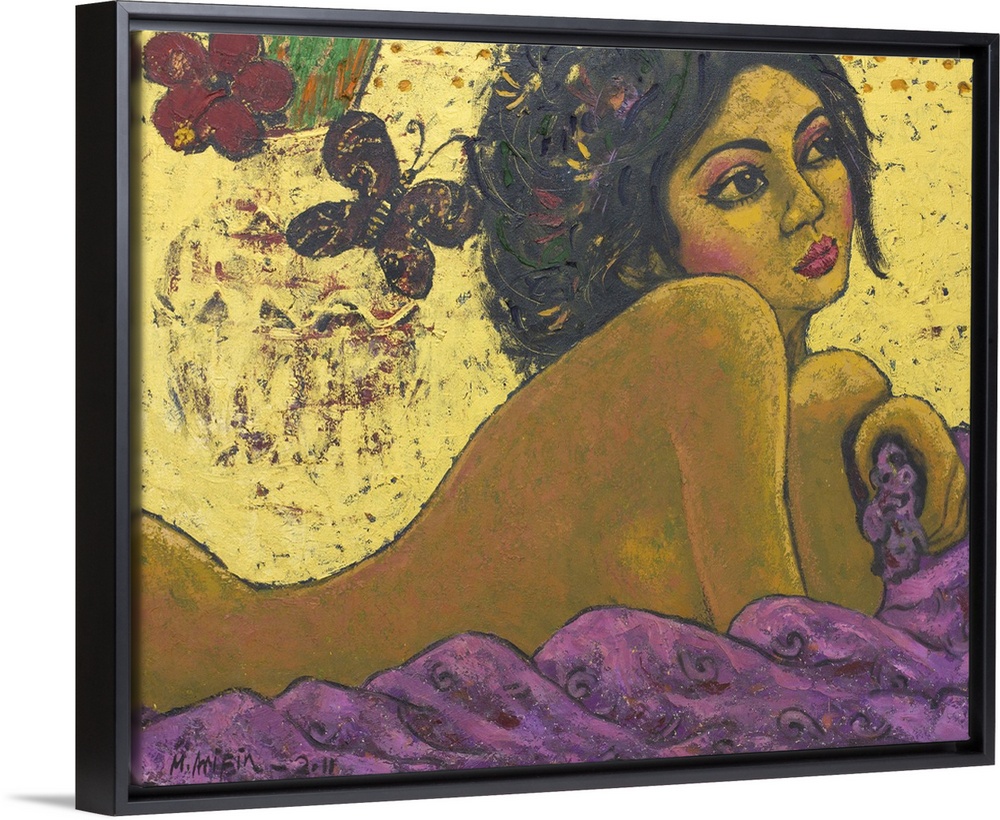 <p>Reclining amid purple silk, a beautiful woman's thoughts are far away. Her gaze seems wistful and somewhat sorrowful. A red hibiscus suggests passion while a dark butterfly flits above the young nude. She is thinking of night butterflies that sip nectar from flowers, Javanese artist Mohammad Arifin says of his compassionate portrait. The Indonesian metaphor for a prostitute is a night butterfly. Titled Wanita dan kupu-kupu in Bahasa Indonesia.</p>