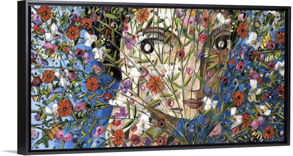 <p>A horizontal portrait of a woman behind a large bouquet of wild flowers on a blue background, painted with cubism elements.</p>
