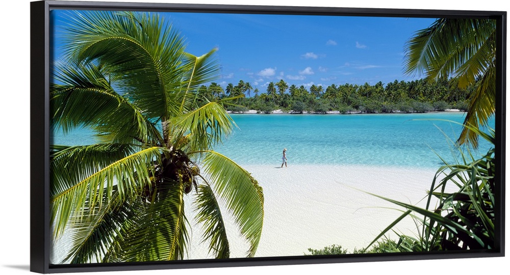 <p>Photograph of a lady walking alone on a white sand beach surrounded by crystal clear water and palm trees.</p>
