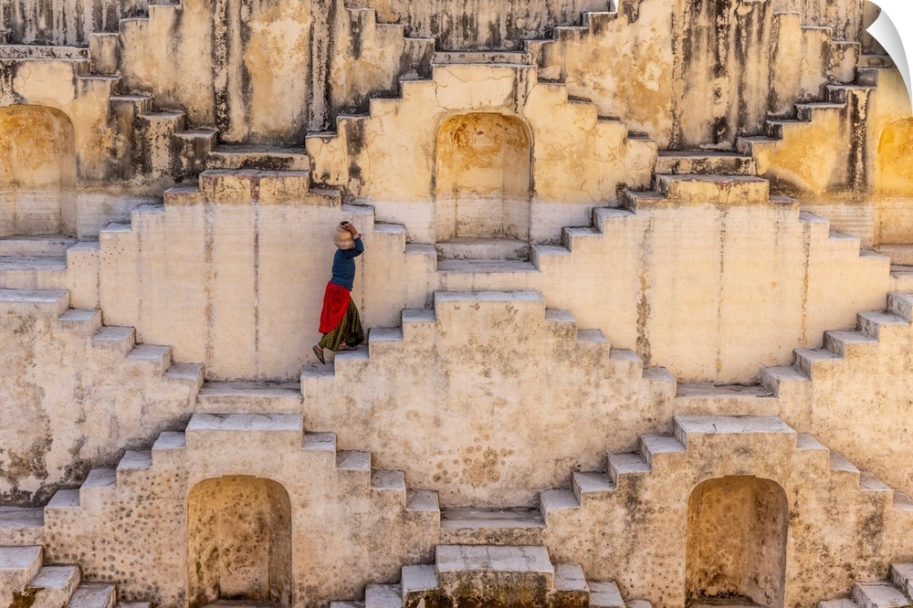 <p>woman carrying jug of water at stepwell in jaipur, india</p>