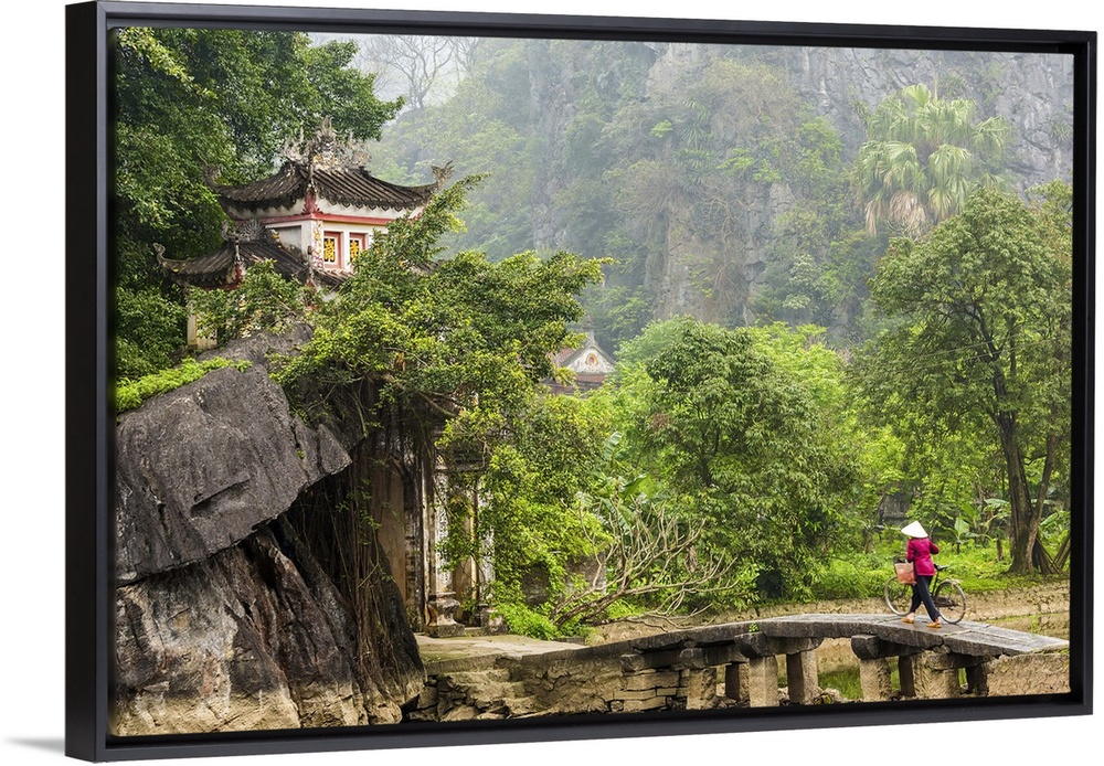 <p>Woman crossing bridge with bicycle to temple, Tam Coc nr Ninh Binh, nr Hanoi, Vietnam</p>