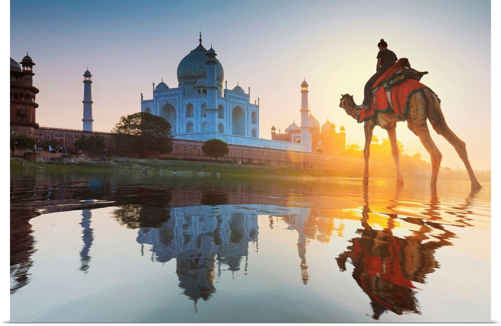 <p>India, Woman Crossing The Yamuna River On A Camel With The Taj Mahal In The Background At Sunset</p>