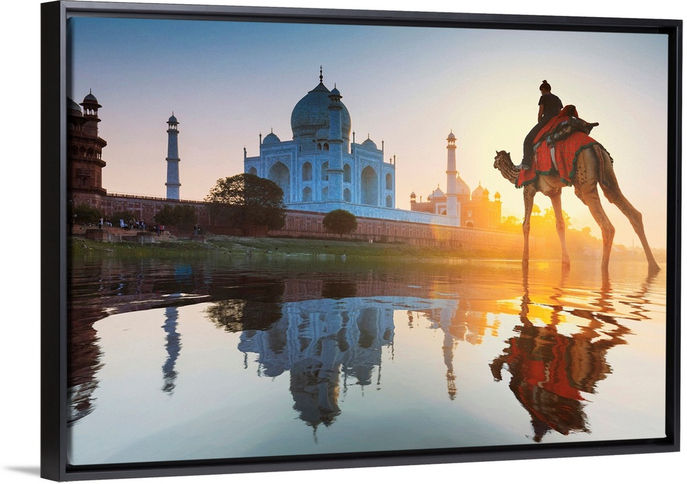 <p>India, Woman Crossing The Yamuna River On A Camel With The Taj Mahal In The Background At Sunset</p>