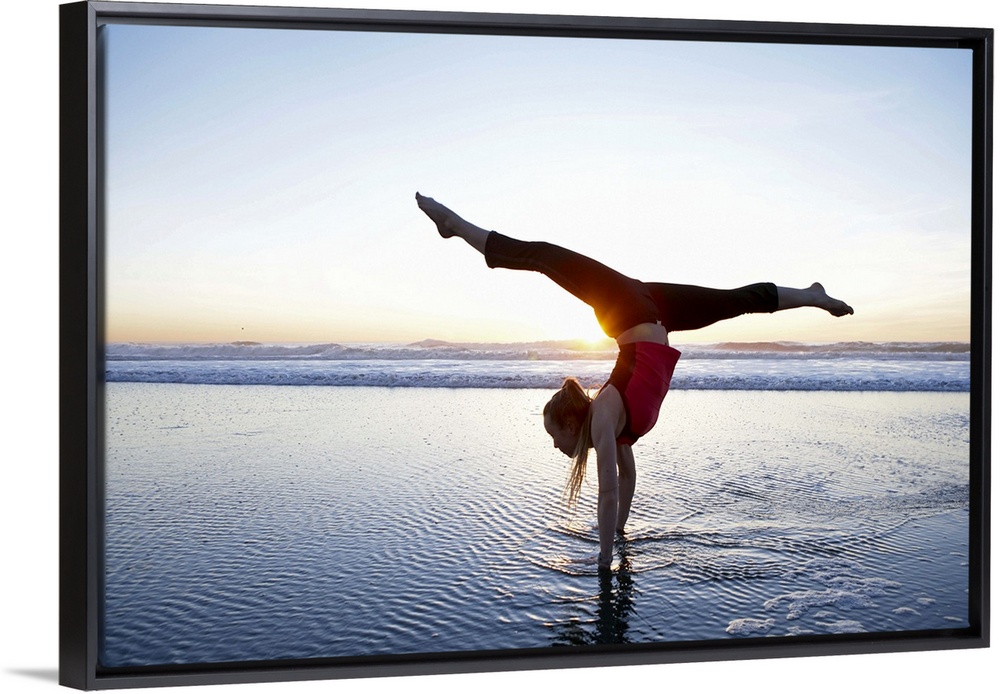 <p>Woman doing a hand-stand on the beach at sunset.</p>