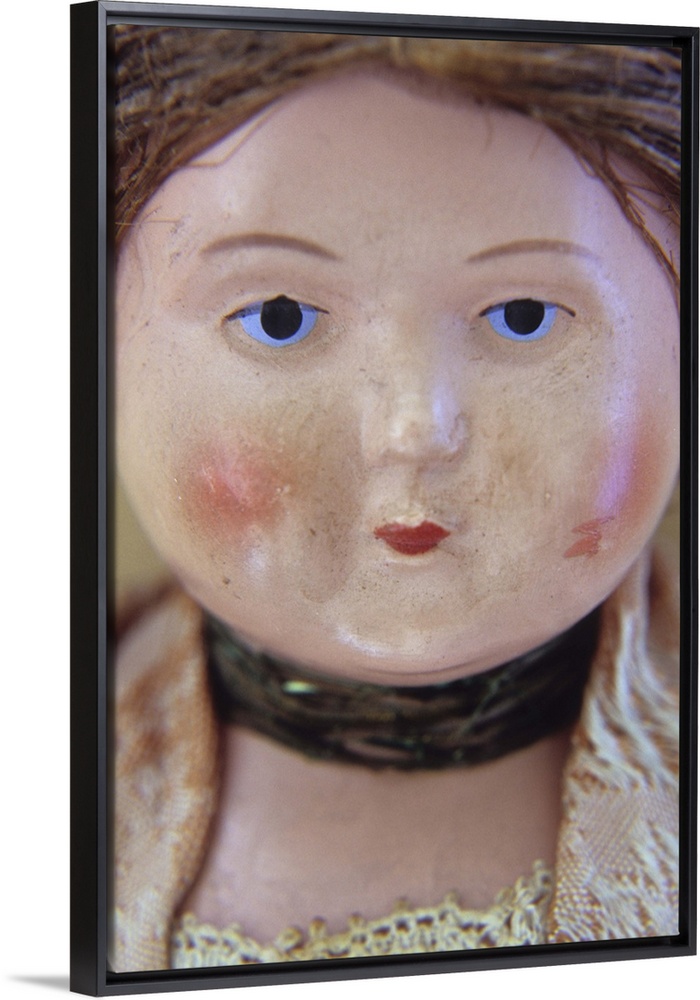 <p>Face of vintage woman doll with tight bun and glum face and wearing lacy clothes and neckband</p>