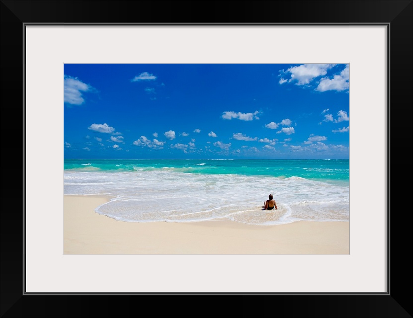 <p>Woman enjoys a perfect beach day of clear skies and blue waters.</p>
