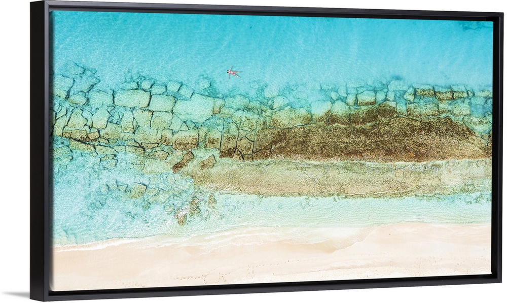 <p>Aerial view of woman floating on the crystal sea in between coral reef and white sand beach, Antigua, West Indies, Caribbean, Central America</p>