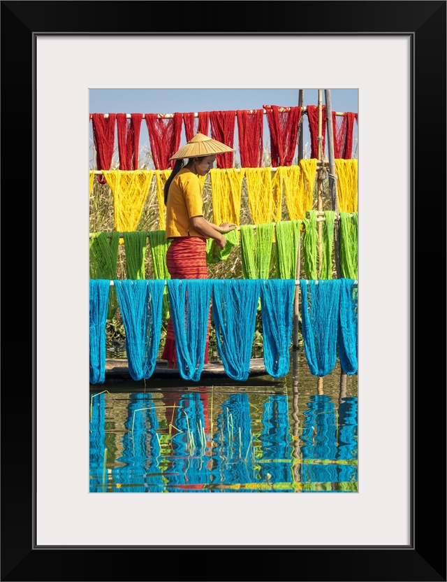 <p>Woman hanging dyed yarn from a boat to dry in a traditional weaving village on Lake Inle, Nyaungshwe Township, Taunggyi District, Shan State, Myanmar</p>