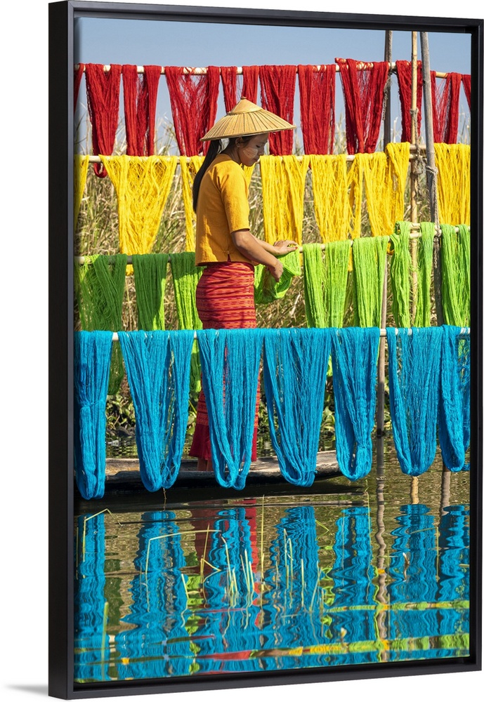 <p>Woman hanging dyed yarn from a boat to dry in a traditional weaving village on Lake Inle, Nyaungshwe Township, Taunggyi District, Shan State, Myanmar</p>