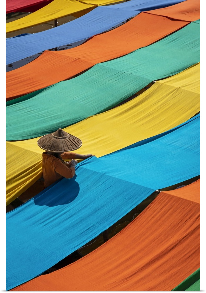 <p>Elevated view of woman hanging long pieces of dyed fabric to dry, Lake Inle, Nyaungshwe Township, Taunggyi District, Shan State, Myanmar</p>