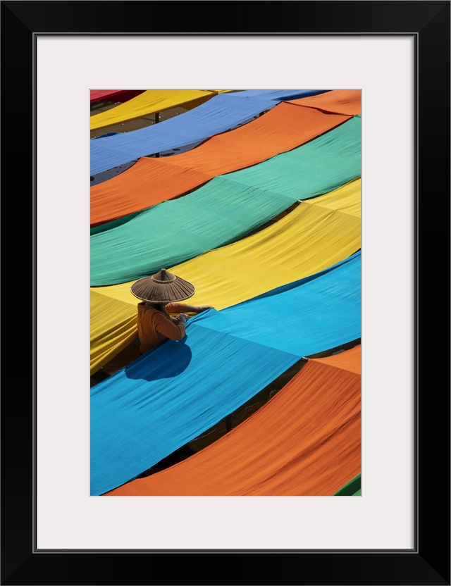 <p>Elevated view of woman hanging long pieces of dyed fabric to dry, Lake Inle, Nyaungshwe Township, Taunggyi District, Shan State, Myanmar</p>