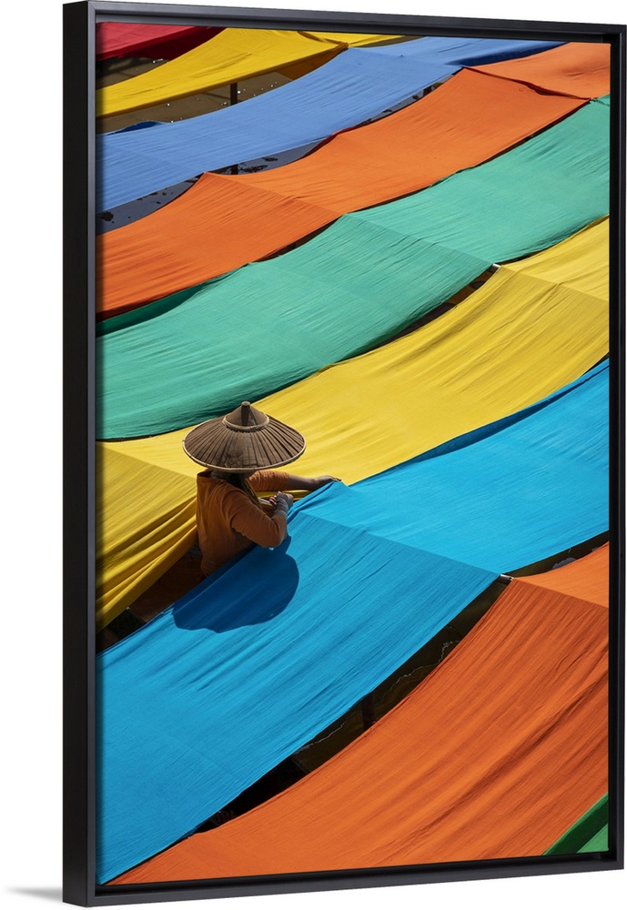 <p>Elevated view of woman hanging long pieces of dyed fabric to dry, Lake Inle, Nyaungshwe Township, Taunggyi District, Shan State, Myanmar</p>