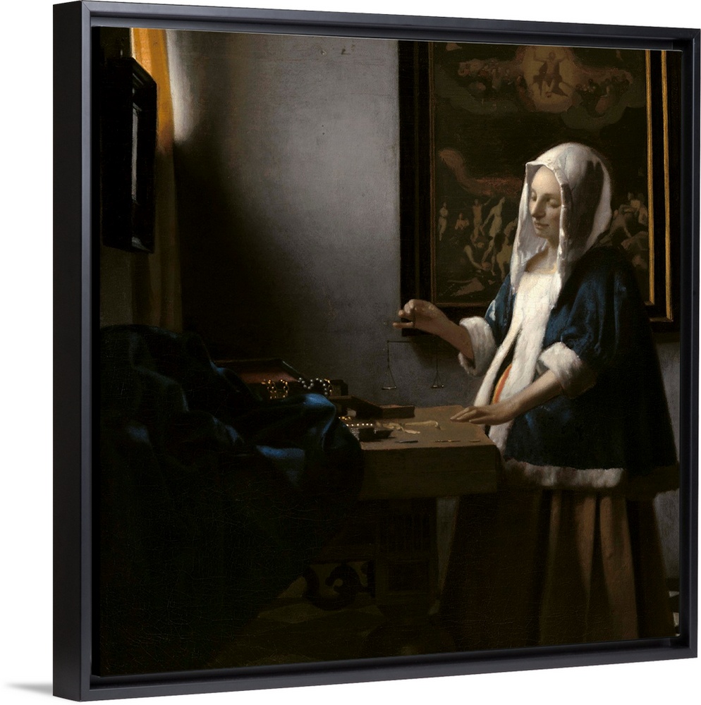<p>Woman Holding a Balance, by Johannes Vermeer, c. 1664, Dutch painting, oil on canvas. A painting of the Last Judgment hangs on the back wall of the room, implying judgement, as the scale balances worldly objects</p>