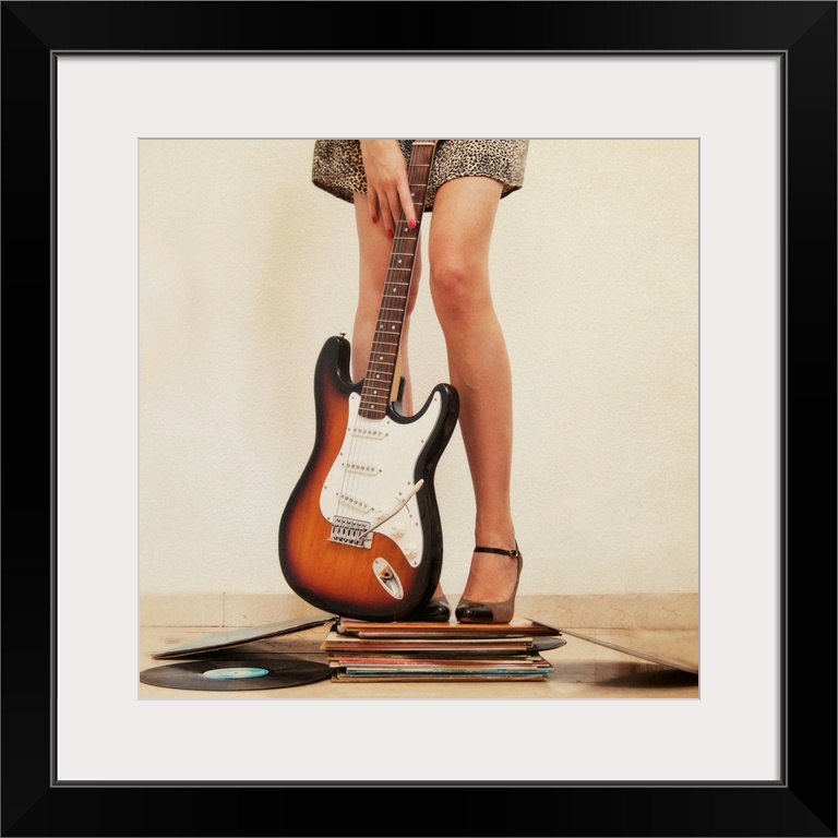 <p>Woman holding guitar and standing on books, close-up.</p>