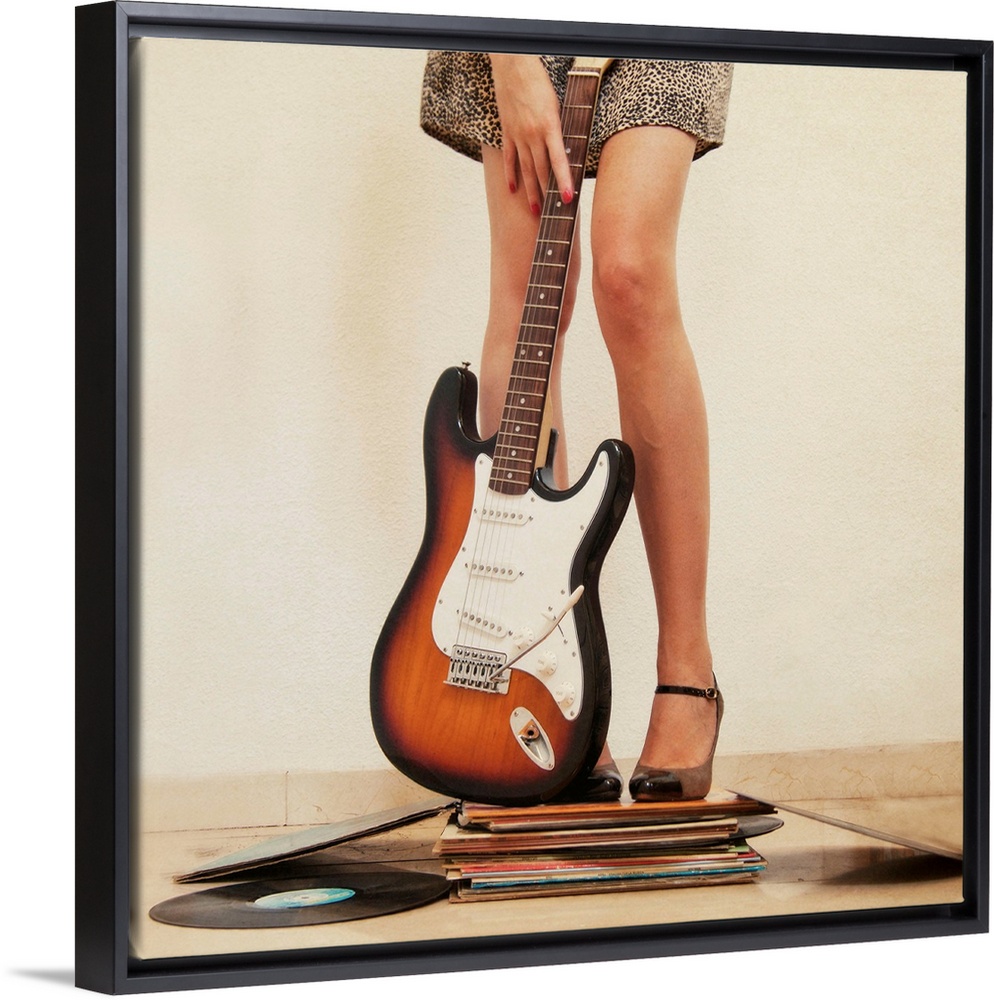 <p>Woman holding guitar and standing on books, close-up.</p>