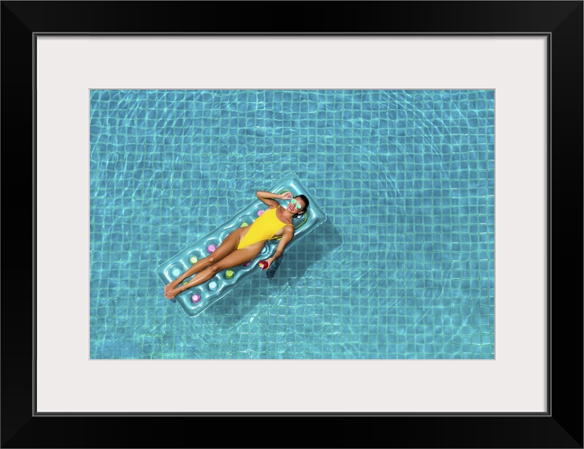 <p>Amazing beautiful female in a yellow bikini air mattress swims in the pool of a luxury hotel, summer vacation, happiness, travel, smile joy, listening to music, drinking cocktail, top view.</p>