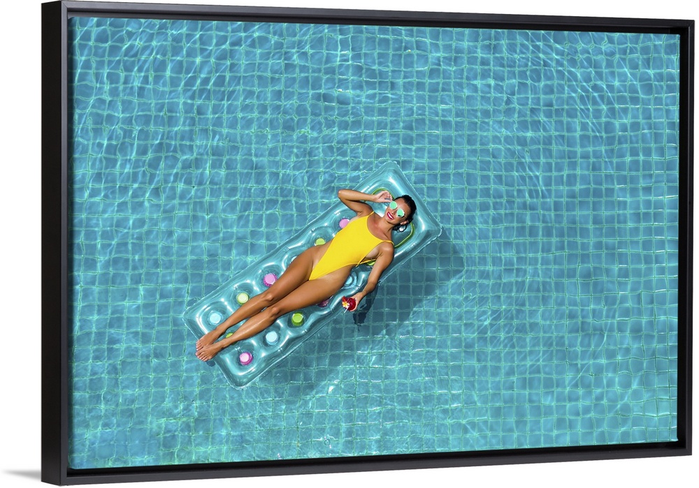 <p>Amazing beautiful female in a yellow bikini air mattress swims in the pool of a luxury hotel, summer vacation, happiness, travel, smile joy, listening to music, drinking cocktail, top view.</p>