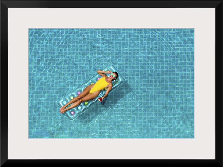 <p>Amazing beautiful female in a yellow bikini air mattress swims in the pool of a luxury hotel, summer vacation, happiness, travel, smile joy, listening to music, drinking cocktail, top view.</p>