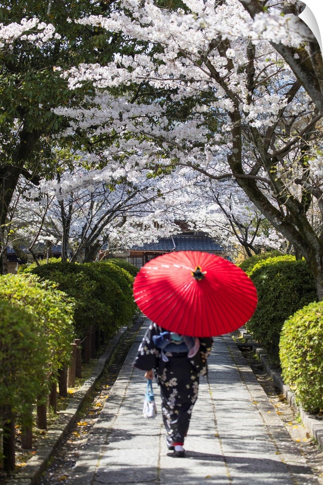<p>Woman In Kimono Walking In Garden With Cherry Blossom, Kyoto, Kansai, Japan (MR)</p>