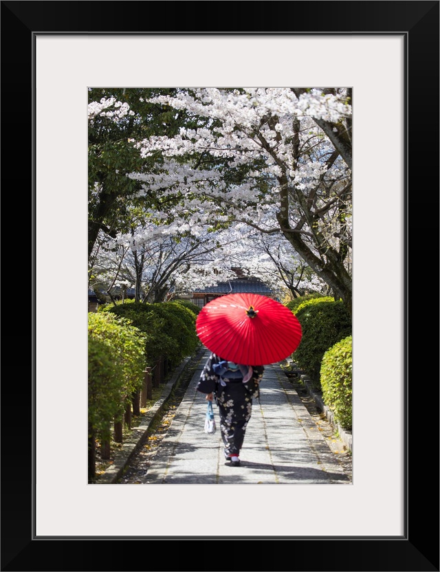 <p>Woman In Kimono Walking In Garden With Cherry Blossom, Kyoto, Kansai, Japan (MR)</p>