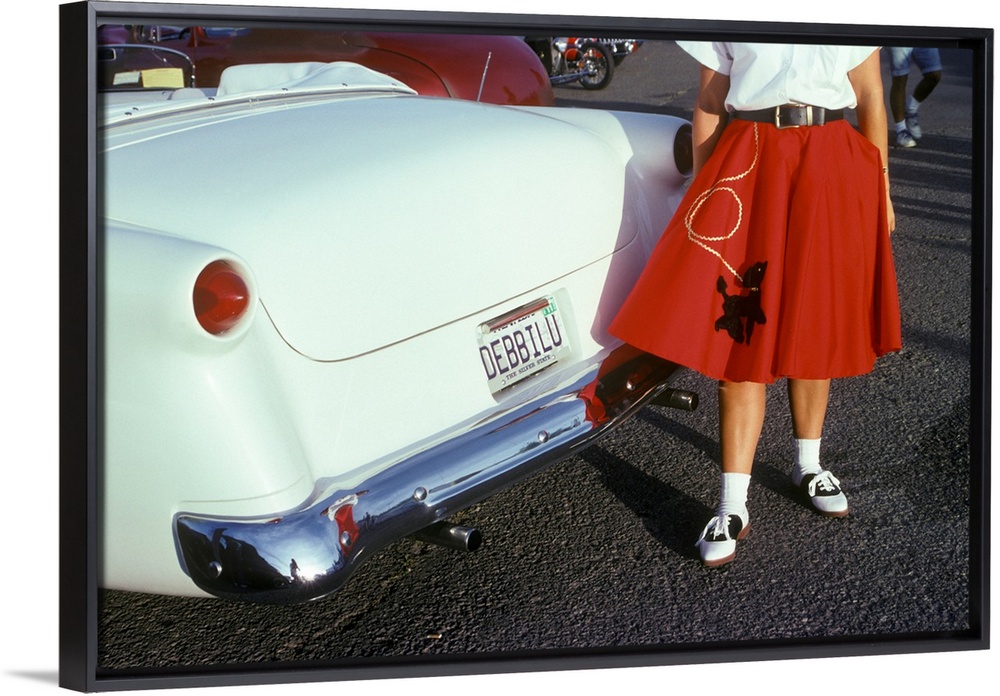 <p>Woman In Red Poodle Skirt And Saddle Shoes Next To White 1950s Car.</p>
