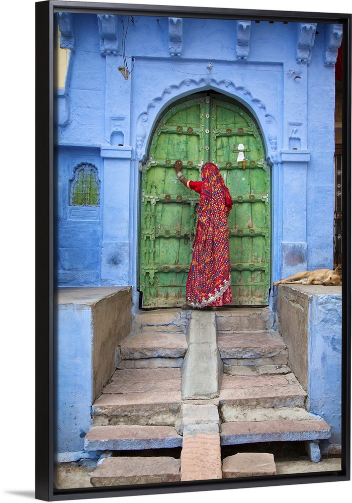 <p>Woman knocking on door in the Blue City of Jodphur, India.</p>