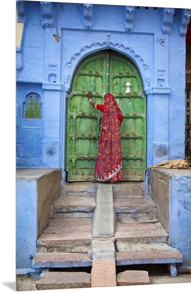 <p>Woman knocking on door in the Blue City of Jodphur, India.</p>