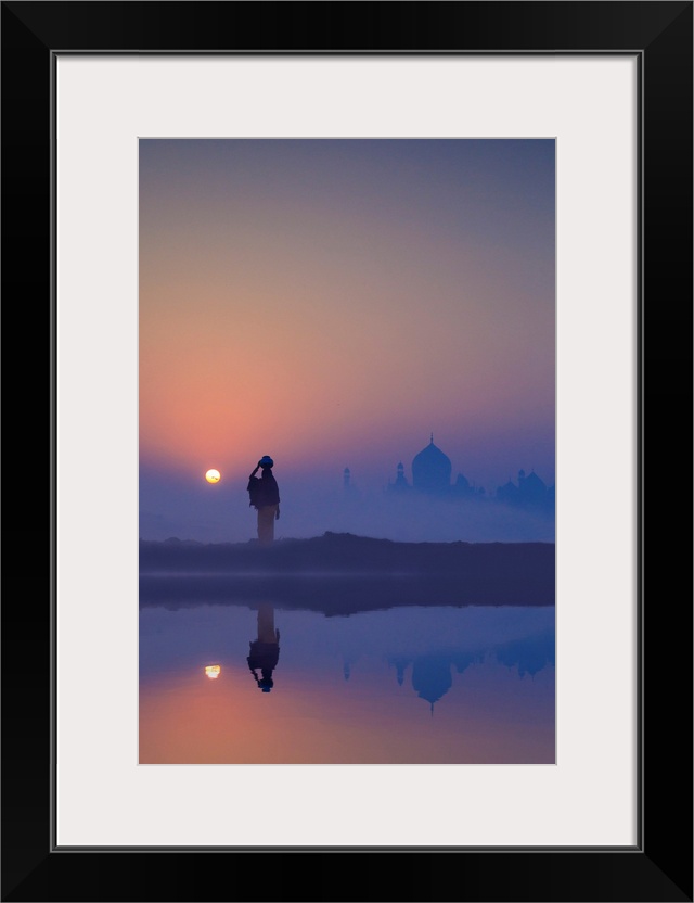 <p>India, Water Carrying A Water Pot On A Foggy Morning With The Sun Rising On The Taj Mahal</p>