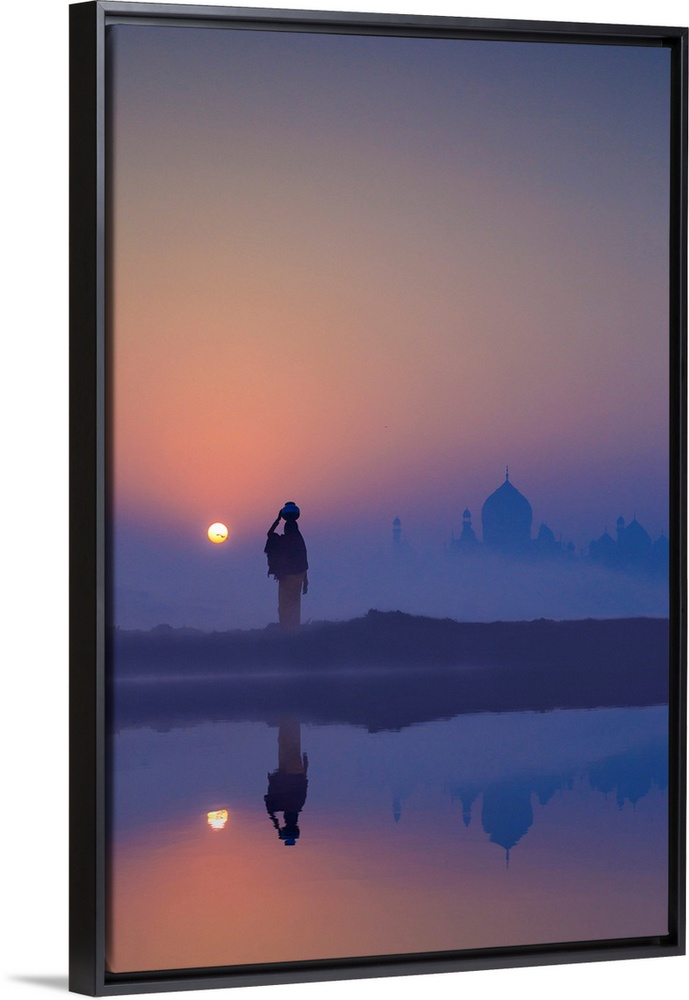 <p>India, Water Carrying A Water Pot On A Foggy Morning With The Sun Rising On The Taj Mahal</p>