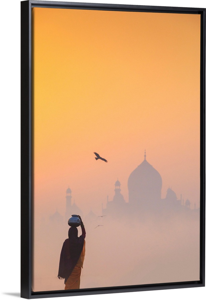 <p>India, Water Carrying A Water Pot On A Foggy Morning With The Sun Rising On The Taj Mahal</p>
