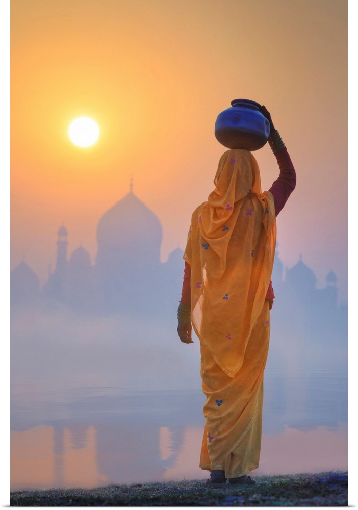 <p>India, Water Carrying A Water Pot On A Foggy Morning With The Sun Rising On The Taj Mahal</p>