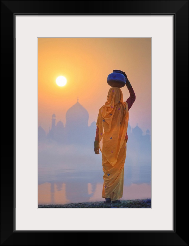 <p>India, Water Carrying A Water Pot On A Foggy Morning With The Sun Rising On The Taj Mahal</p>