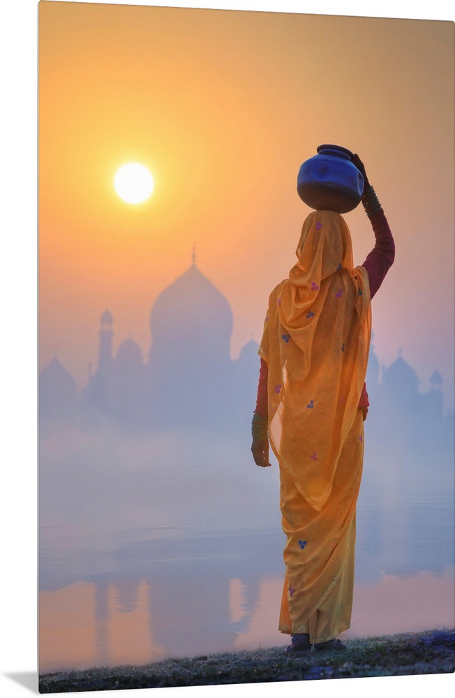 <p>India, Water Carrying A Water Pot On A Foggy Morning With The Sun Rising On The Taj Mahal</p>