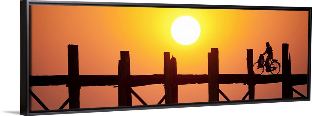 <p>Woman on her bike across the Ubein Bridge in Burma at sunset</p>