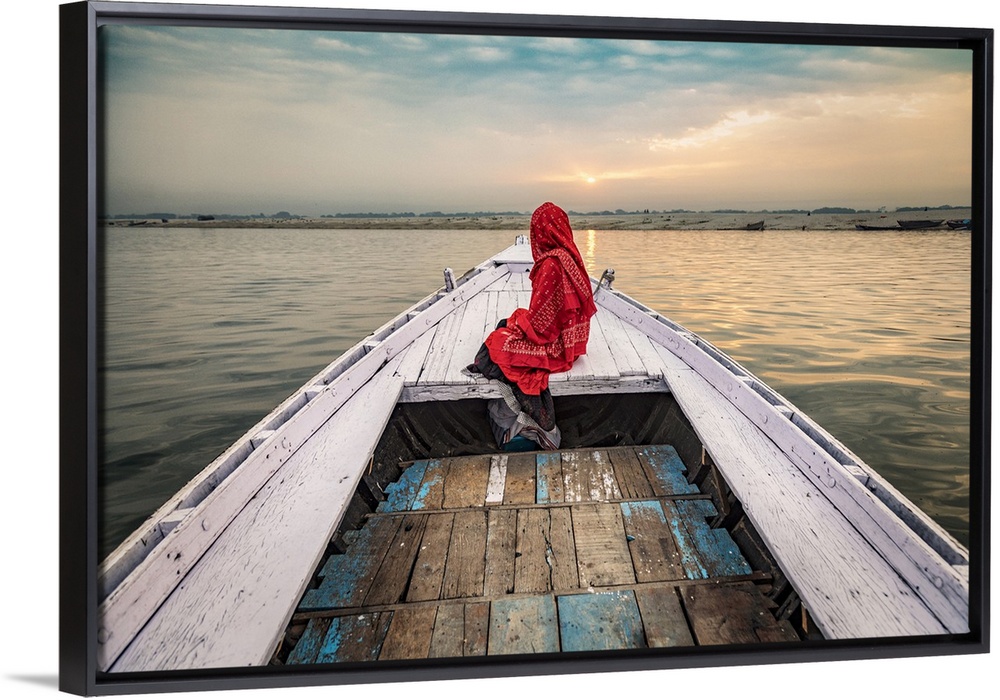 <p>Woman on longtail boat on the Ganges River, Varinasi, India</p>