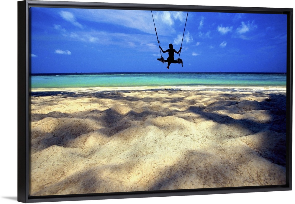 <p>landscape, large photograph of the silhouette of a woman on a swing over the sandy beach, looking out toward crystal blue waters of the ocean in Koh Samui, Thailand.</p>
