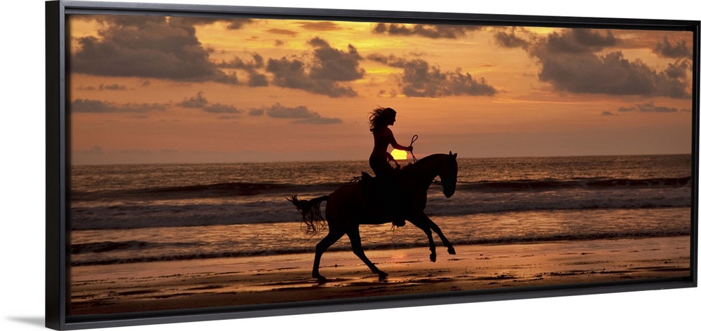 <p>Woman riding a horse on the beach at sunset in Costa Rica</p>