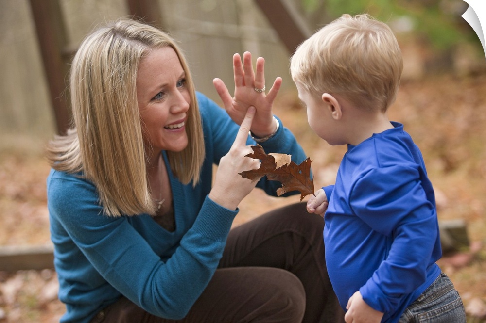 <p>Woman signing the word 'Leaf' in American Sign Language while communicating with her son</p>